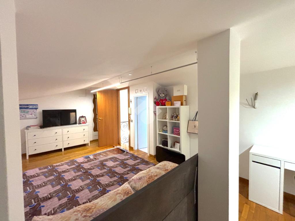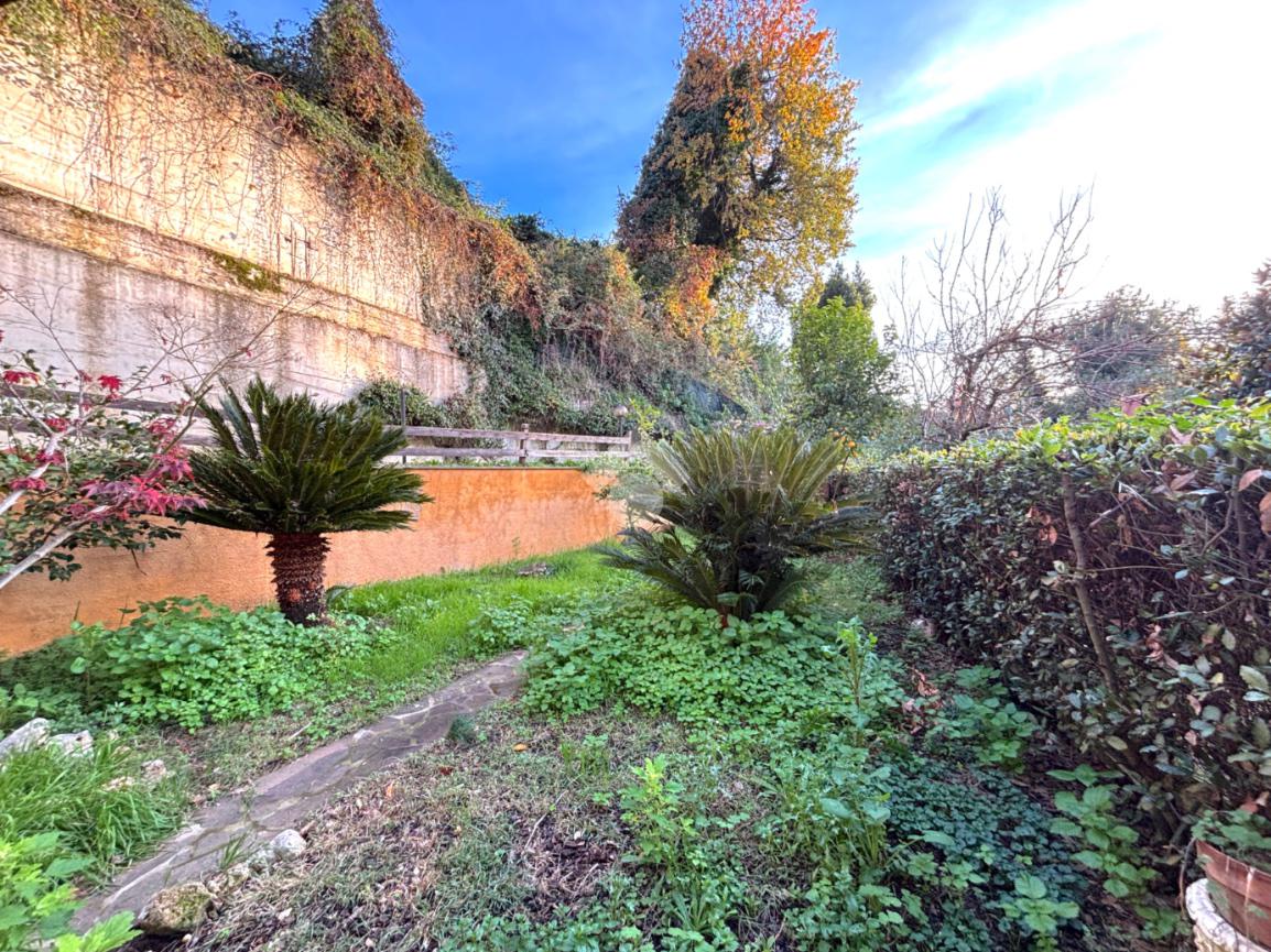 Il primo appartamento è disposto su più livelli. Al piano terra: salone con camino termo-ventilato, cucinotto a vista e bagno di servizio finestrato; al primo piano, la zona notte: disimpegno, camera da letto matrimoniale con accesso ad un terrazzo di circa 30 mq, cameretta e bagno finestrato con doccia; all'ultimo piano, la mansarda, composta da camera da letto con ripostiglio/cabina armadio, bagno finestrato con vasca ed un secondo ripostiglio. All'esterno un bel portico di 70 mq e il giardino circostante di circa 370 mq.